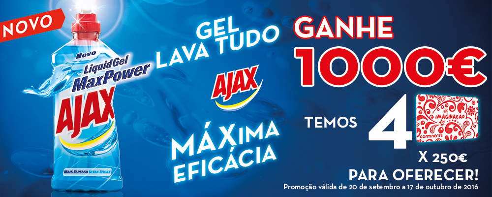 Compre 2 produtos da marca Ajax (um produto obrigatóriamente da gama "Max Power"), escreva uma frase com as palavras "Ajax" e "máxima eficácia" e junte o talão de compra. As 4 frases mais criativas ganham um cartão Dá Presentes de 250€.